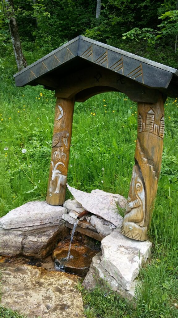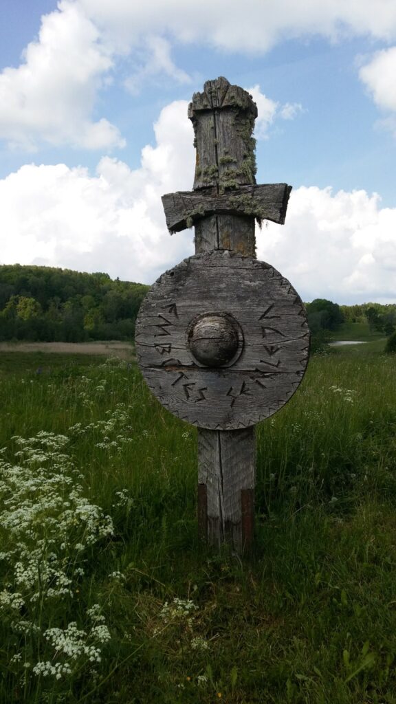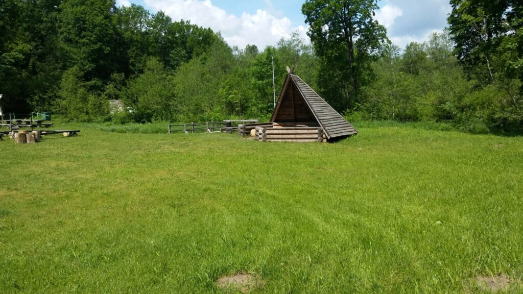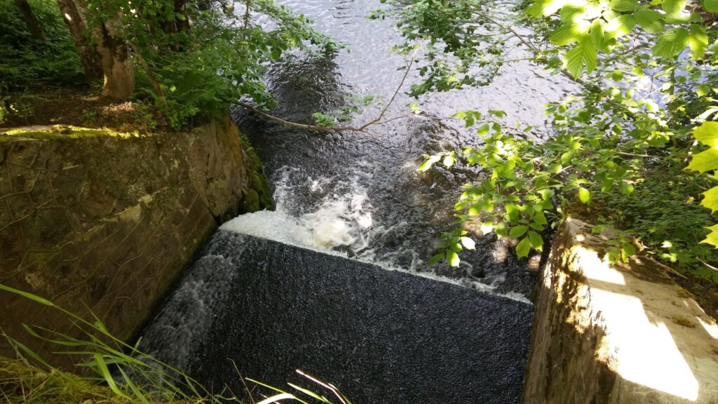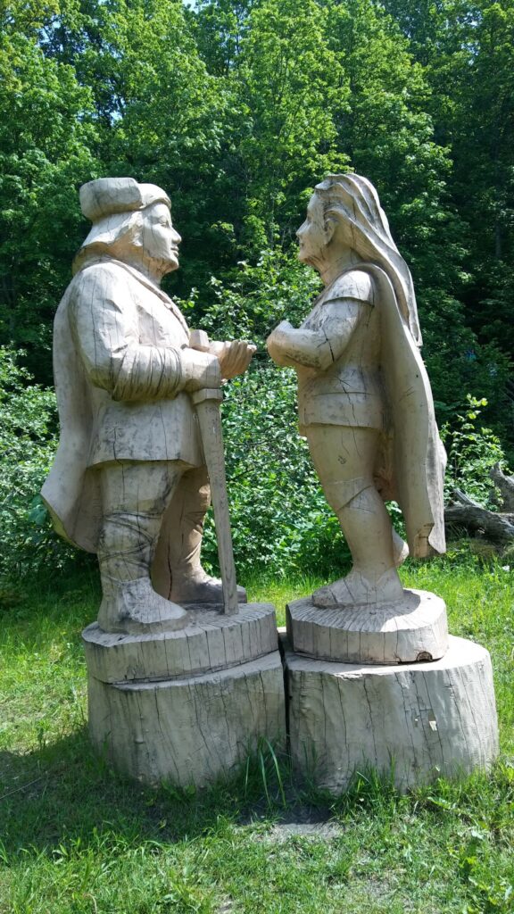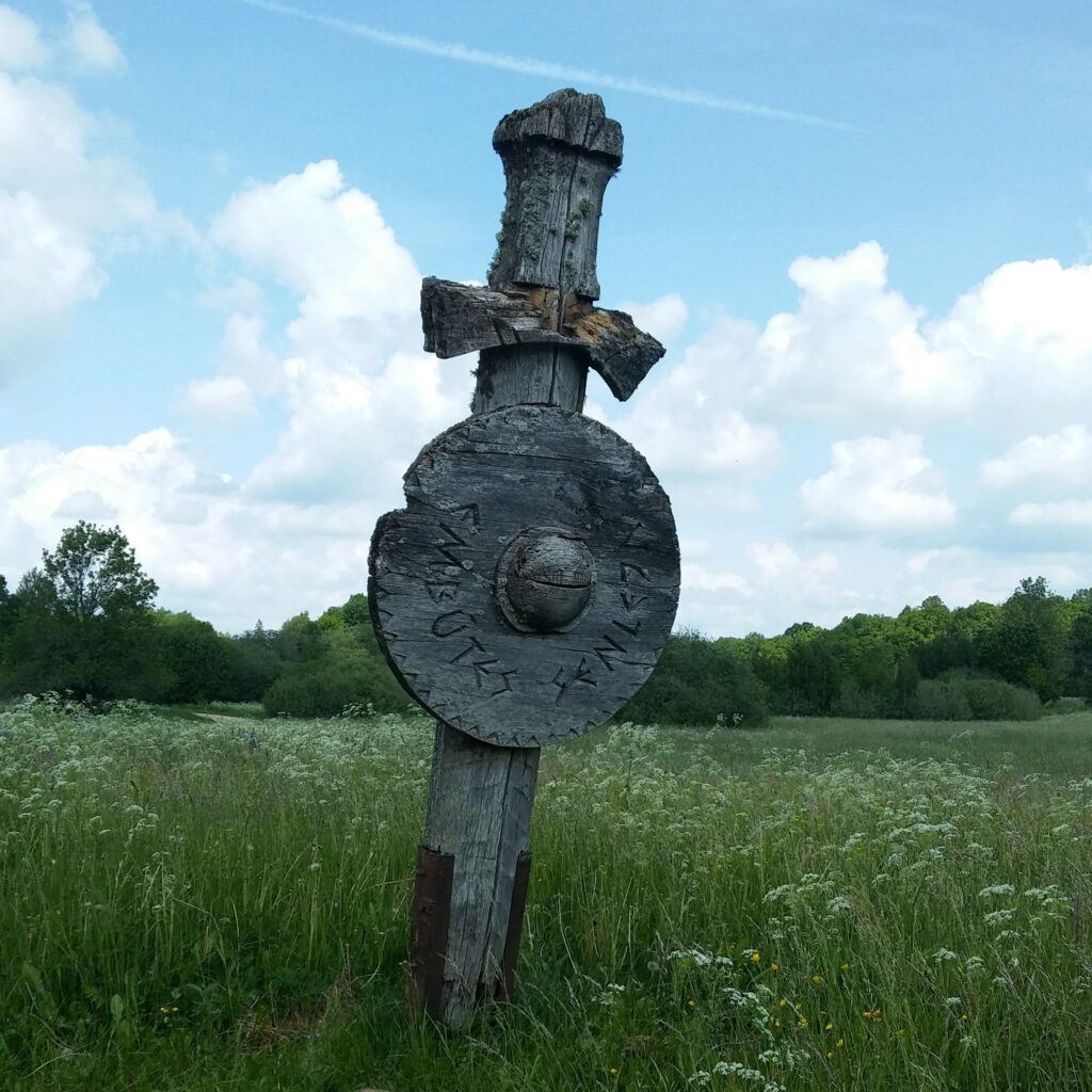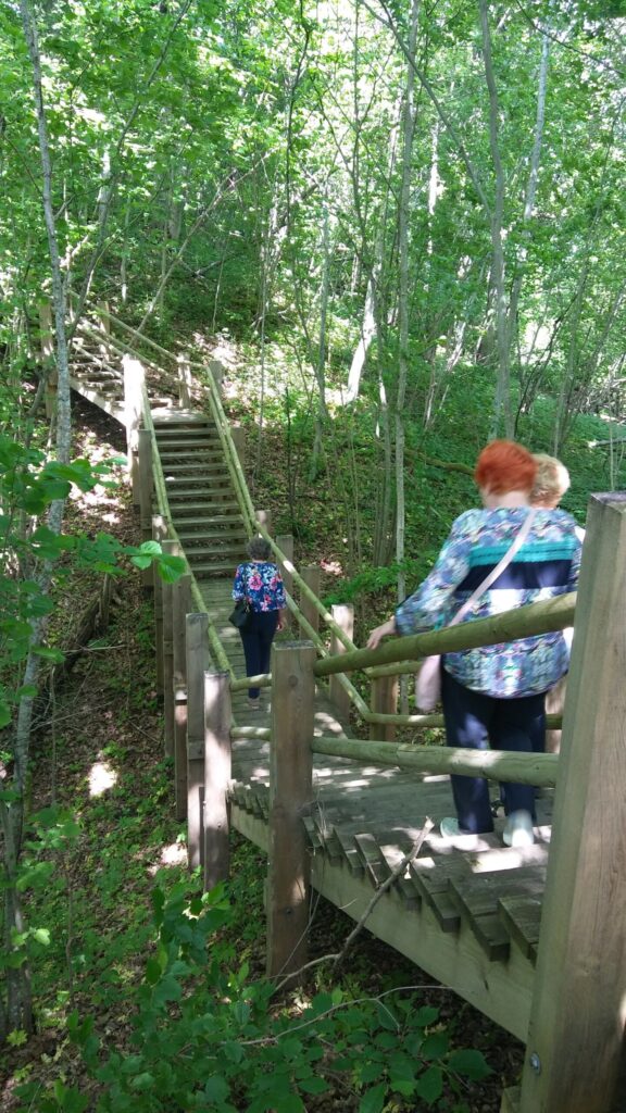 Pa koka kāpnēm augšup lejup pārejam pāri kalnam un nonākam Joda dambī, kur ir atpūtas vieta ar ūdeni, jo tur tek avotiņš, ugunskura un telšu vietas. Gide stāsta, ka avotiņš ir kādas skaistas meitenes asaras, jo pils nogrimusi ar jaunu skaistu meiteni. Turpat arī Joda pēdakmens un Induļa un Ārijas koka skulptūras. Tad ceļš vijas cauri skaistām, ziedošām pļavām uz koka skatu torni, no kura paveras burvīga ainava. Pēc tam mēs izejam no parka pa ieejas vārtiem, kur abās pusēs ir lieli koka zobeni ar vairogiem. “Zobeni ir uzstādīti 80.gados un, protams, prasās pēc restaurācijas darbiem, bet pagaidām mums tas nav paceļams. Pēc nostāstiem viens ir Induļa un otrs viņa drauga Pūdiķa zobens. Kamēr šie zobeni te stāv, tikmēr senleja tiek aizsargāta,” saka gide.