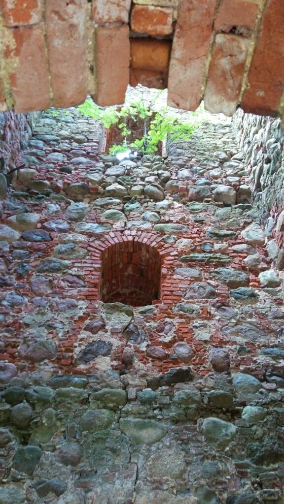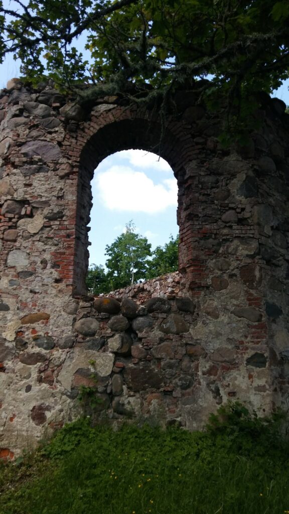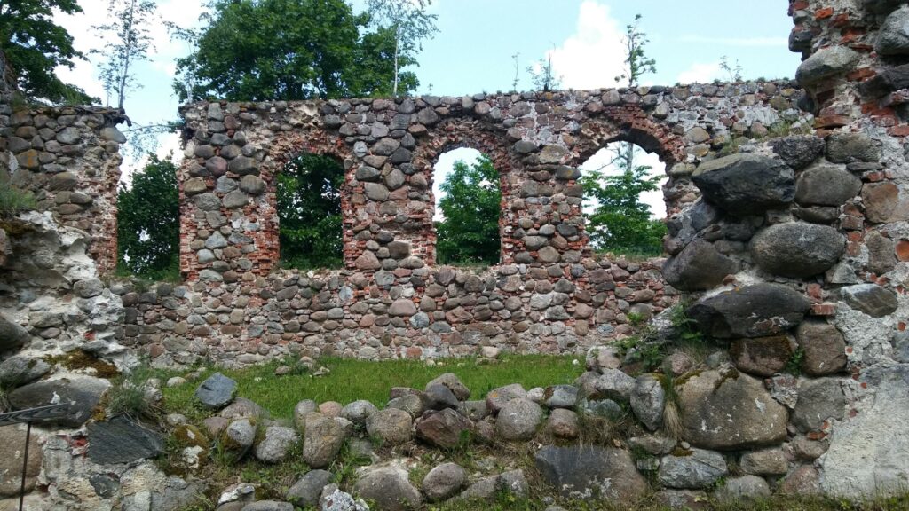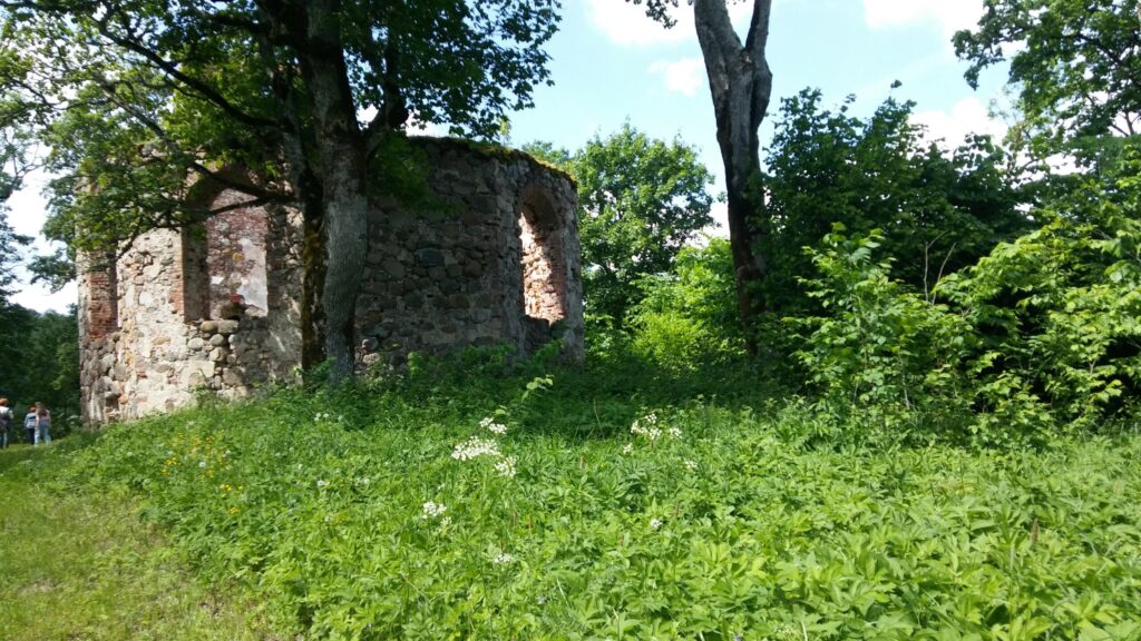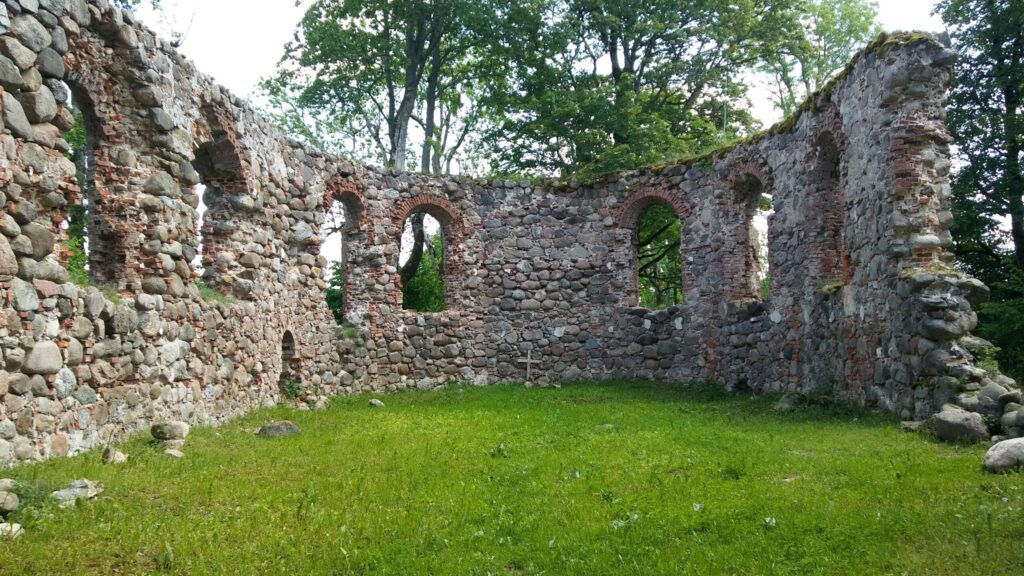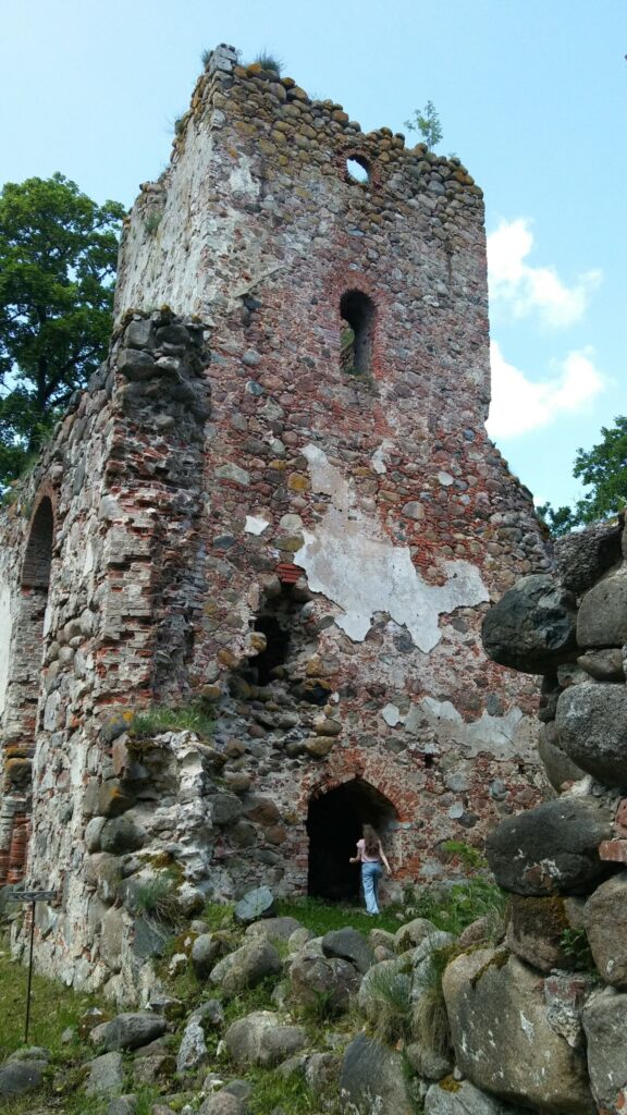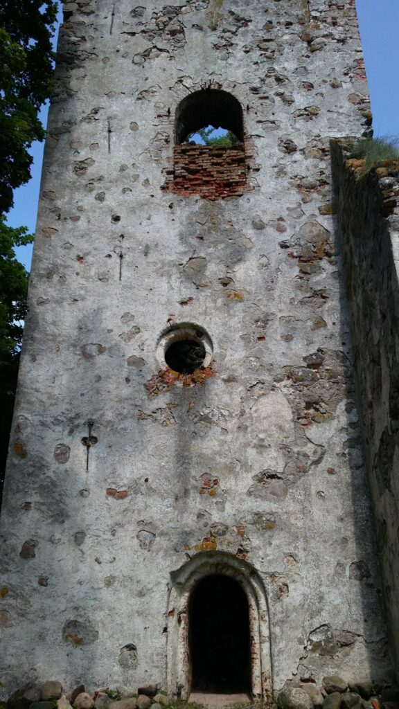 Nākamais objekts ir baznīcas drupas, kas pārsteidz ar savu grandiozumu. Lai gan palikušas tikai mūra sienas un zvana tornis, kurā var pamanīt artilērijas lādiņu atstātās pēdas, tomēr arī tas liecina, ka baznīca tiešām bijusi iespaidīga un skaista. Vietējā gide stāsta, ka, baznīcu ceļot, uzbēra zemes valni un būvēja tālāk, kamēr tika līdz augšai. Kad baznīca bija uzcelta, šos zemes vaļņus vienkārši no mūriem atrušināja. Tā nu sanāk, ka baznīca atrodas kalnā. “Ir iztīrīta grīda līdz pamatiem. Katru gadu vismaz pāris laulības vai kristības te notiek,” saka gide. Seni nostāsti vēsta, ka no baznīcas vedusi slepena eja, kas stiepusies no pils dīķa un savienojusi to ar bruņinieku pili. Pa to uzbrukuma gadījumā pils iemītnieki varējuši bēgt uz baznīcu.