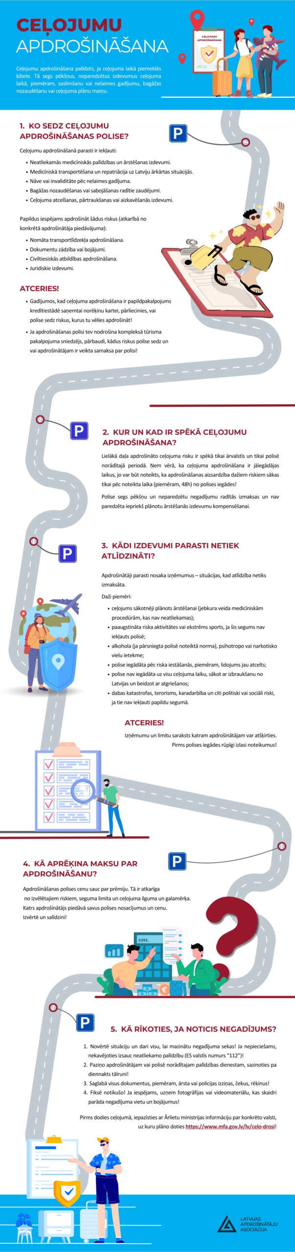 Turpinot izglītojošo kampaņu par dažādiem apdrošināšanas veidiem, LAA kopā ar sadarbības partneriem ir sagatavojusi ceļojumu apdrošināšanas ceļa karti. Tajā vienkāršā valodā skaidrota ceļojumu apdrošināšanas darbība, izmantojot ceļa kartes principu, t. sk. ko apdrošināšana parasti sedz, kādi riski var tikt papildus ietverti, ko apdrošināšana nesedz.