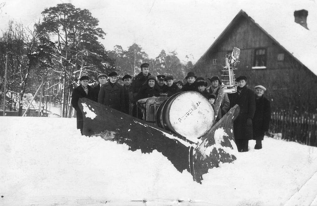 Bauskas ceļu pārvaldes darbinieki 11. ceļu inženieru postenī pie sniega arkla jeb šķūres, kas uzmontēta traktoram “Caterpillar”. 1930. gadu beigas. Foto no Latvijas ceļu muzeja.