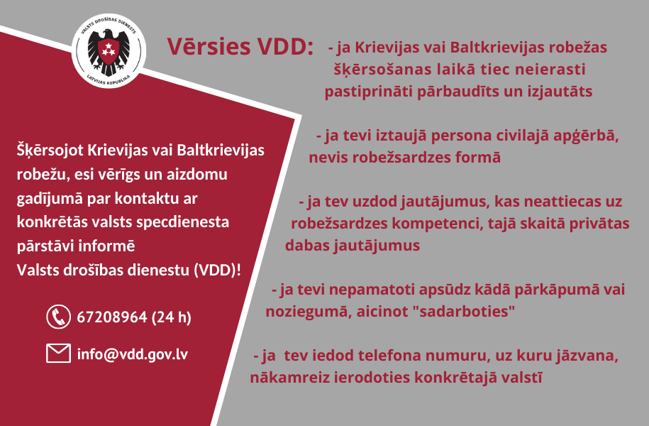 Aizdomu gadījumā par kontaktu ar Krievijas vai Baltkrievijas specdienesta pārstāvi VDD aicina sniegt par to informāciju, zvanot uz dienesta diennakts tālruni 67208964 vai rakstot uz e-pasta adresi “info@vdd.gov.lv”. VDD garantē informācijas sniedzēja konfidencialitāti.