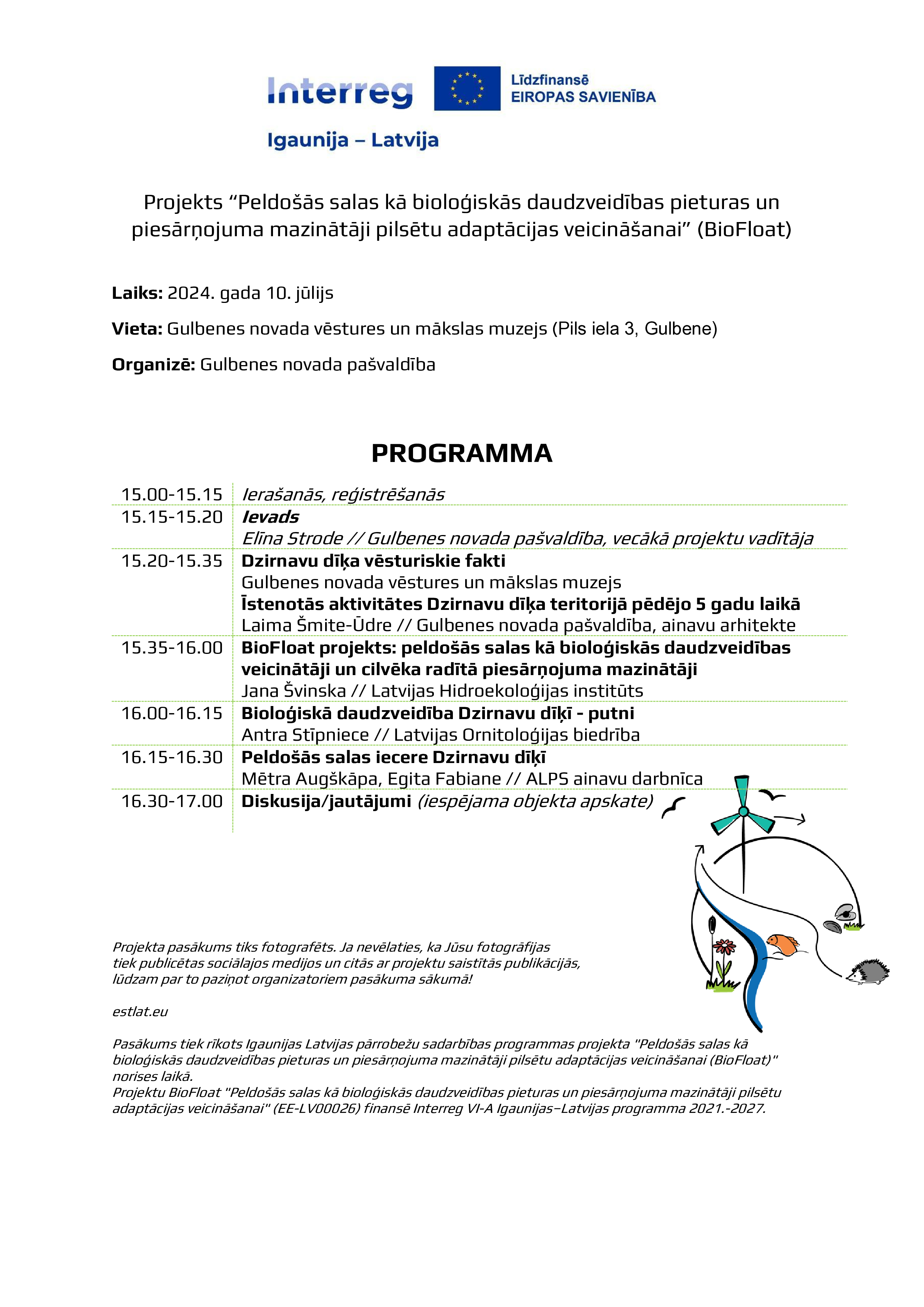 Pasākuma laikā varēs uzzināt par Dzirnavu dīķa vēsturiskajiem faktiem, pēdējos piecos gados īstenotajām aktivitātēm dīķa teritorijā. Latvijas Hidroekoloģijas institūta zinātnieki runās par iecerētās peldošās salas kā bioloģiskās daudzveidības veicinātāju un cilvēka radītā piesārņojuma mazinātāju. Savukārt par bioloģisko daudzveidību Dzirnavu dīķī stāstīs Latvijas Ornitoloģijas biedrības pārstāve. Noslēgumā klātesošie tiks iepazīstināti ar peldošas salas ieceri.