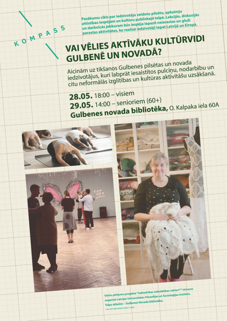 Gulbenes pilsētas un novada iedzīvotāji, kuri labprāt iesaistītos pulciņu, nodarbību un citu neformālās izglītības un kultūras aktivitāšu uzsākšanā, 28.maijā pulksten 18.00 Gulbenes novada bibliotēkas telpās ir aicināti piedalīties un apmeklēt tikšanos, kurā būs iespēja uzzināt vairāk par iedzīvotāju iesaisti kultūrdzīves veidošanā, apkaimju attīstību un kultūru publiskajā telpā.
