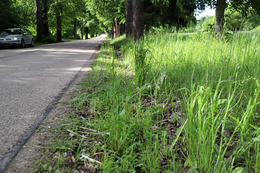 ● pļauj 1,0–1,5 metru platumā nomalē un tai piegulošajā nogāzē, kā arī uz sadalošās joslas, kas ir šaurāka par 12 metriem;