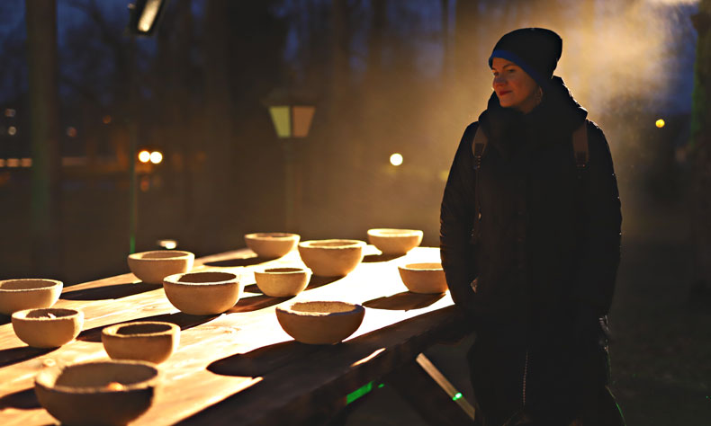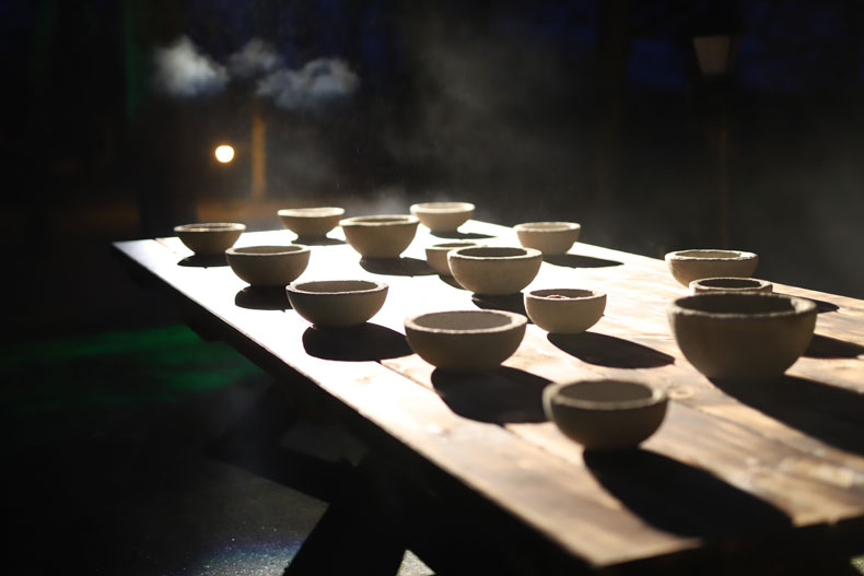 “Lai sagatavotu veļu mielasta galdu, mums palīdzēja amatnieks Vilis Birznieks, kurš izveidoja masīvu koka galdu. Gaismotājs Kaspars Zondaks veidoja īpašu gaismu spēli un māksliniece Evija Ločmele izveidoja betona bļodas. Betona bļodas ir manis izlolota ideja, jo zināju, ka tās atradīsies ārā un gribējās, lai tās ir masīvas,” stāsta L.Tērauda.