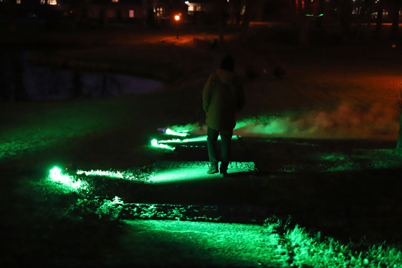 Instalācijas apgaismojums veido gaismas starus, kuri atgādina ēkas konstrukciju, līdz ar to sniedz sajūtu, ka cilvēks atrodas klētī.