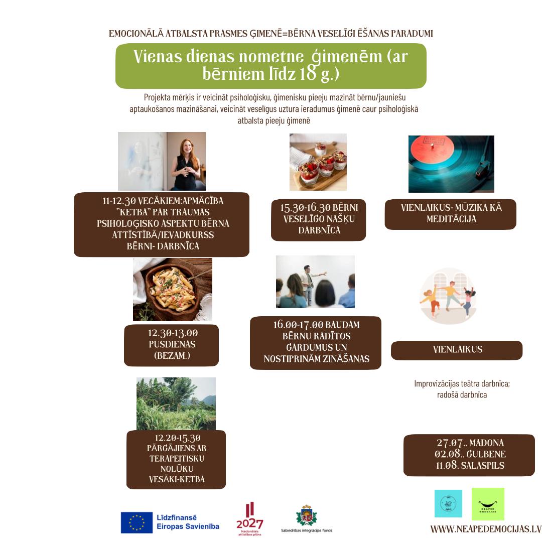 Vecāki gūs zināšanas apmācībās KETBA (paremocionālas traumas psiholoģisko aspektu bērna attīstībā), savukārt bērni tikmēr dosies pārgājienā ar terapeitisku nolūku ar improvizācijas teātra elementiem. Plānotas arī praktiskas aktivitātes, piemēram, veselīga uztura kūkas gatavošana, kas vienlaikus būs gan izglītojoša, gan saliedējoša pieredze visai ģimenei.