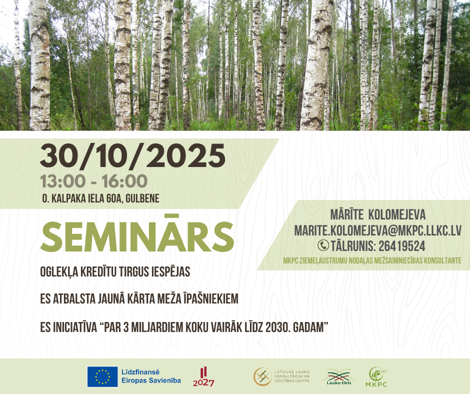 Latvijas Lauku konsultāciju un izglītības centrs 30. oktobrī aicina uz informatīvo bezmaksas semināru “Oglekļa kredītu tirgus iespējas, ES atbalsta jaunā kārta meža īpašniekiem, ES iniciatīva “Par 3 miljardiem koku vairāk līdz 2030. gadam”.