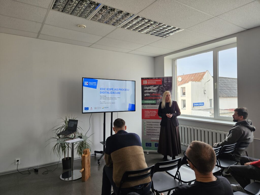 Ieva Kreile, EDIC Vidzemes kontaktpunkta vadītāja, iepazīstināja ar EDIC piedāvātajiem pakalpojumiem uzņēmumu un organizāciju digitālajai izaugsmei un plānotajām aktivitātēm Vidzemes reģiona uzņēmumiem. Viņa uzsvēra, ka šādas iniciatīvas palīdz uzņēmumiem droši spert pirmos soļus digitālajā pārveidē.