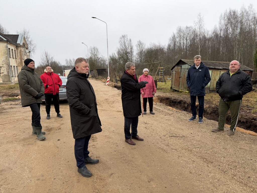 TIKTIES AR VIESTURA IELAS IEDZĪVOTĀJIEM 18. decembrī bija ieradušies pieci deputāti un trīs pašvaldības darbinieki. Attēlā: novada domes priekšsēdētājs Normunds Mazūrs (centrā), viņa vietnieks Gunārs Babris (priekšplānā), deputāti Andis Caunītis (otrais no labās), pašvaldības būvinženieris Gints Āboliņš (no kreisās), Viestura ielas iedzīvotāji Sergejs Mollers (otrais no kreisās), Valda Dzilna un Andrejs Puķīte (no labās). Foto: Diāna Odumiņa