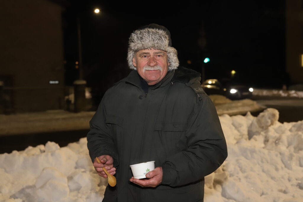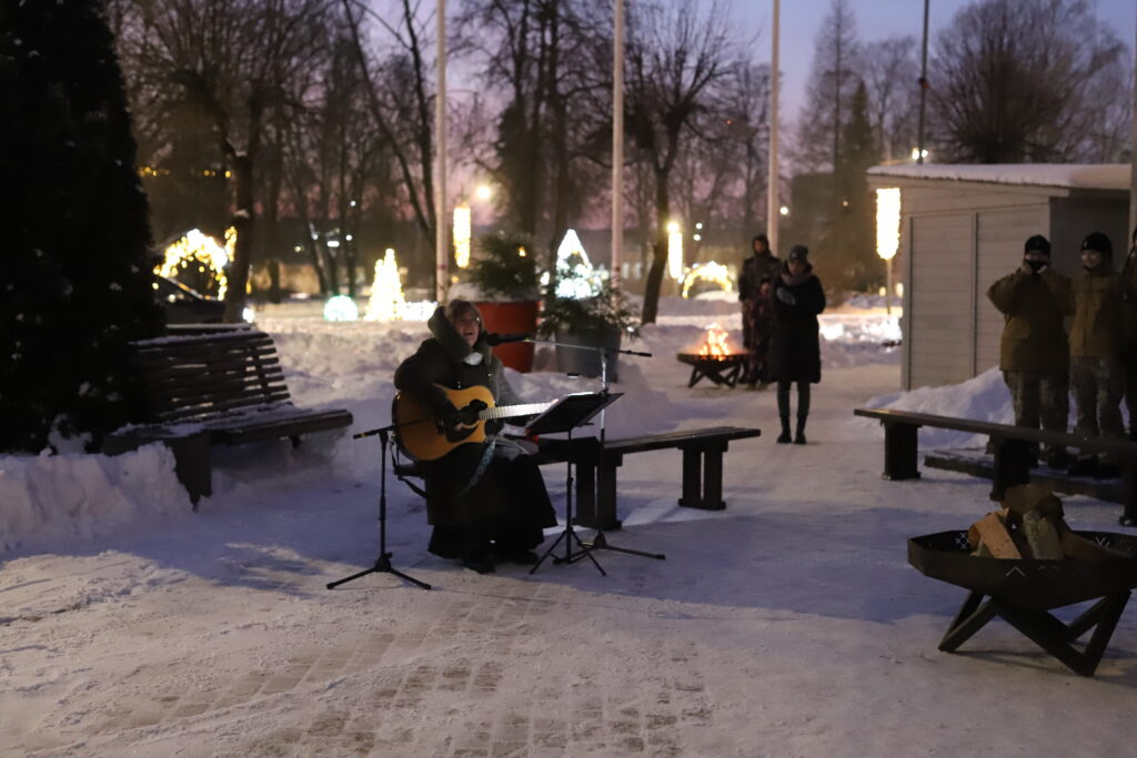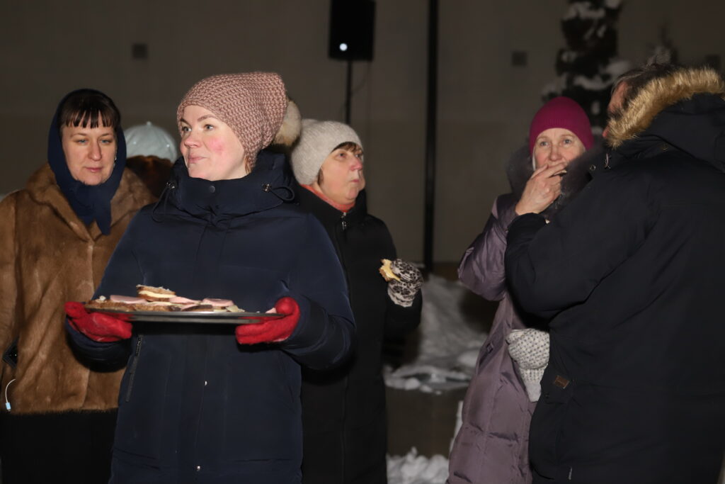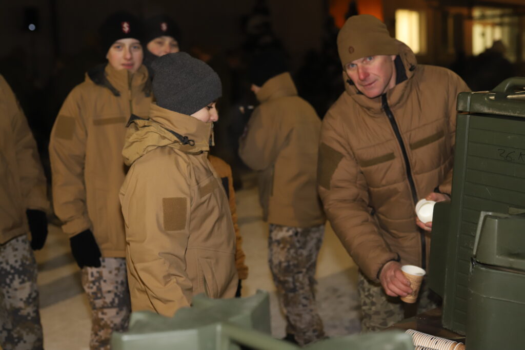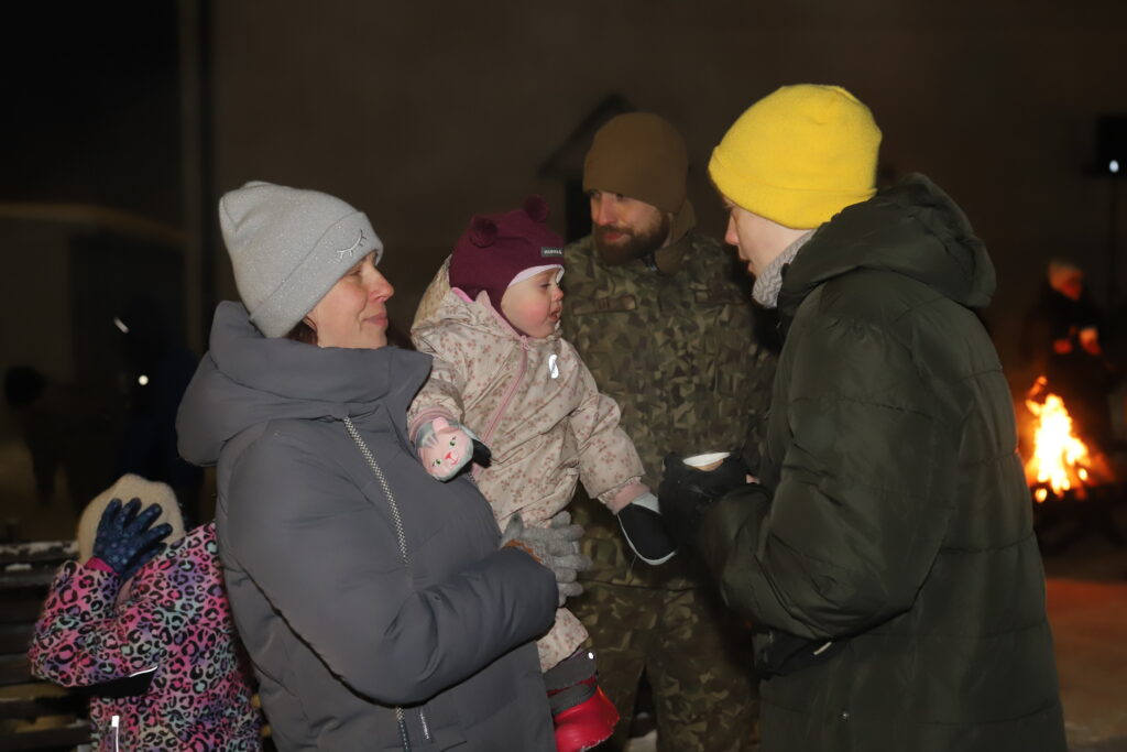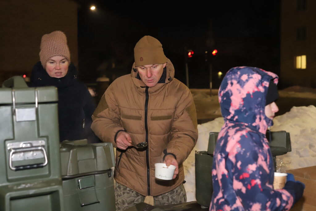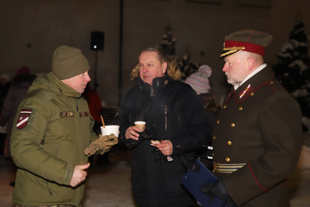 Pasākumam turpinoties neformālā gaisotnē, bija iespēja cienāties ar silto ēdienu – pelēkajiem zirņiem ar speķi, klāt piedzerot karstu tēju. Cienasts bija sarūpēts no Zemessardzes lauku virtuves.