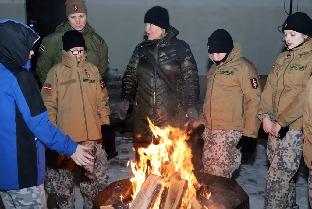 PIE 1991. GADA janvāra barikāžu simboliskā piemiņas ugunskura Gulbenē – novada vidusskolas jaunsargi Rauls Sidorovs (no kreisās), Ralfs Taurenis un Sāra Bētere kopā ar savu instruktori, novada deputāti Lāsmu Gabdulļinu (no kreisās). Interesi par Jaunsardzi izrādīja gulbeniete Gita Gorbenko. Foto: Gatis Bogdanovs