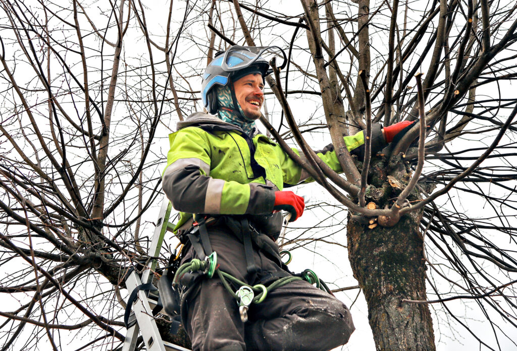 Kamēr nav sākušas plaukt lapas, liepas “polardē” (saudzīgs veids, kā kopt atsevišķu koku un krūmu sugu vainagus – red.) arborists Reinholds Stūriška kopā ar saviem kolēģiem.