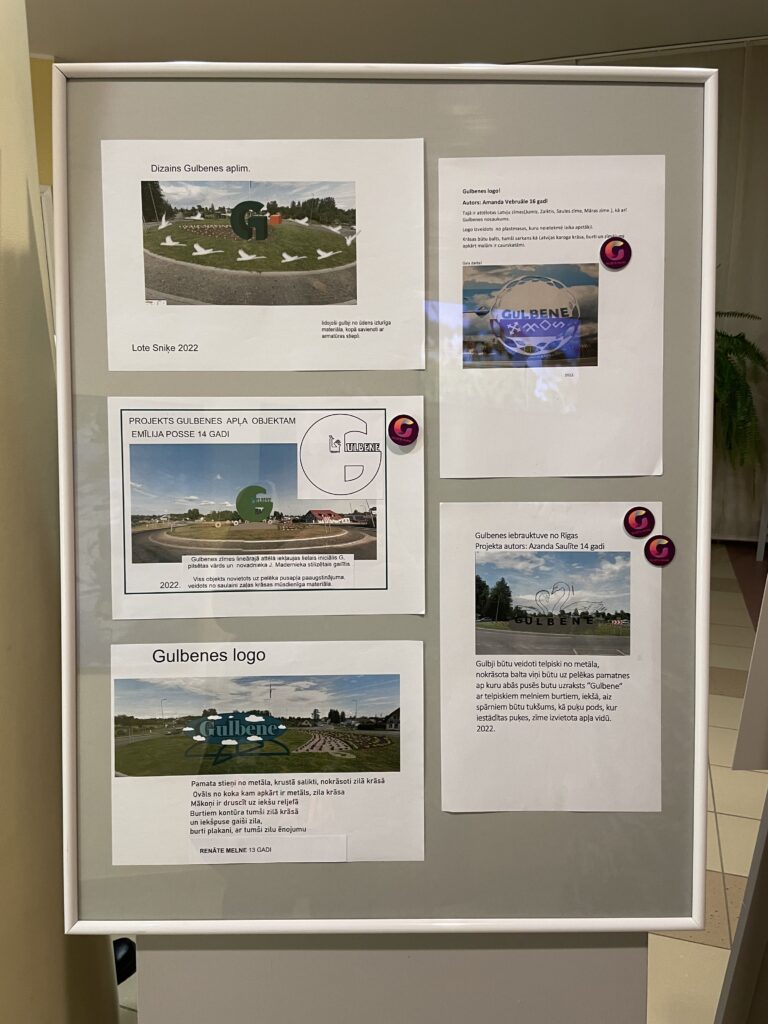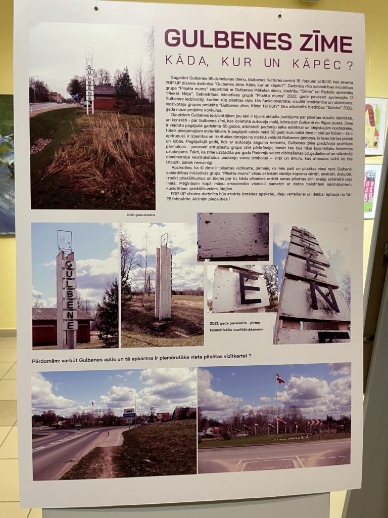 S.Dikmane teica – kultūras centra foajē ir skatāmi Gulbenes mākslas skolas audzēkņu darbi no skolas arhīva, kuros ir viņu redzējums par Gulbeni. Un ir arī bērnu redzējums par iespējamo jauno Gulbenes pilsētas identitātes zīmi. Taču šie bērnu un jauniešu piedāvājumi nav jāuztver kā kaut kas absolūts. Tas esot viņu skatījums, domas, kas, iespējams, var dot ierosmi arī profesionālajiem māksliniekiem, ja viņi to vēlēsies.