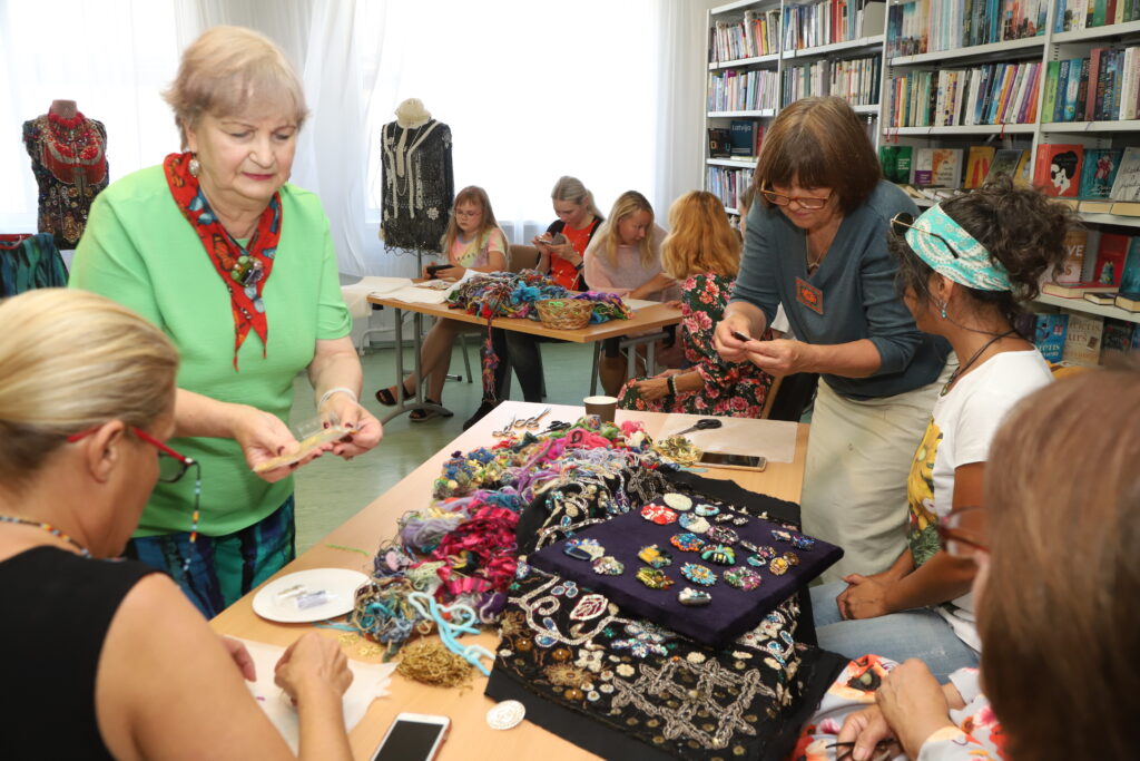 Tīmekļošanas-pērļošanas darbnīcā varēja iemēģināt savu roku neparastajās mākslas tehnikās, to vadīja novadniece Laima Bakāne. Foto: Gatis Bogdanovs.