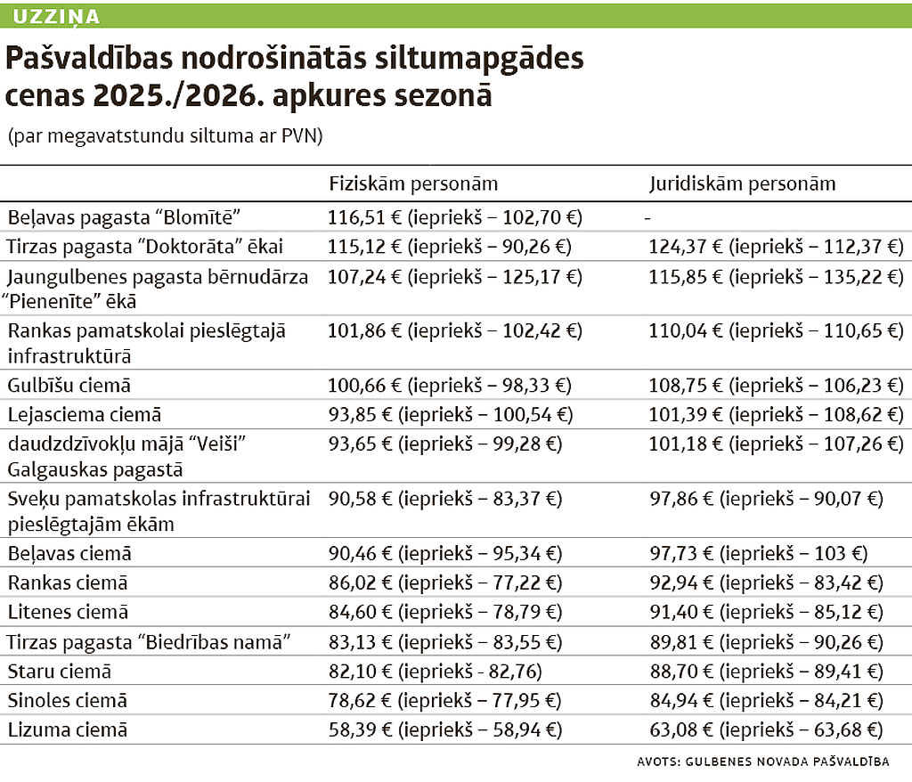 Dārgāks siltums jaunajā apkures sezonā būs “Blomītē”, Litenes, Sinoles, Gulbīša, Rankas ciemā, kā arī Tirzas pagasta “Doktorātā”, Sveķu pamatskolas un Rankas pamatskolas infrastruktūrai pieslēgtajās ēkās. Savukārt Druvienas pagastā pašvaldība jaunajā sezonā siltumu nodrošinās tikai savas infrastruktūras iestādēm, centrālapkure fiziskajām un citām juridiskajām personām tur vairs netiek nodrošināta.