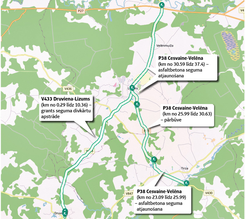 Autoceļa Cesvaine–Velēna (P38) asfaltētajos posmos no krustojuma ar autoceļu Tirza–Jaungulbene–Liede (V430) līdz Tirzas skolai (23,05.–25,96. km) un no Lizuma līdz krustojumam ar Smiltene–Gulbene (P27) (30,64. – 37,29. km) atjaunos asfaltbetona segumu.