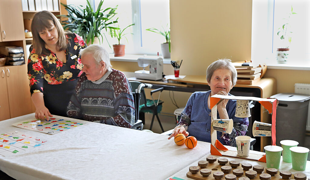 “Ir telpa, kur notiek sociālās rehabilitācijas nodarbības. Darbiniecēm ir liels darbs piemeklēt atbilstošas nodarbības klienta veselības stāvoklim un vajadzībām. Pirms tam notiek novērtēšana pēc aprūpes līmeņiem. Ar klientiem, kuriem ir ceturtais aprūpes līmenis, vairāk jāstrādā individuāli. Katram klientam ir individuāla pieeja. Darbinieces pašas klienta vajadzībām gatavo, piemēram, kognitīvos prāta treniņa uzdevumus līdzīgi kā bērniem bērnudārzā, ar tiem arī klienti labāk tiek galā. Tie ir reti gadījumi, kad klienti no šejienes atgriežas mājās. Tie klienti, kuriem ir trešais un ceturtais aprūpes līmenis, ir atkarīgi no personāla,” tikšanās laikā ar Valsts prezidentu stāstīja “Jaungulbenes Aleju” vadītāja Marika Andževa.