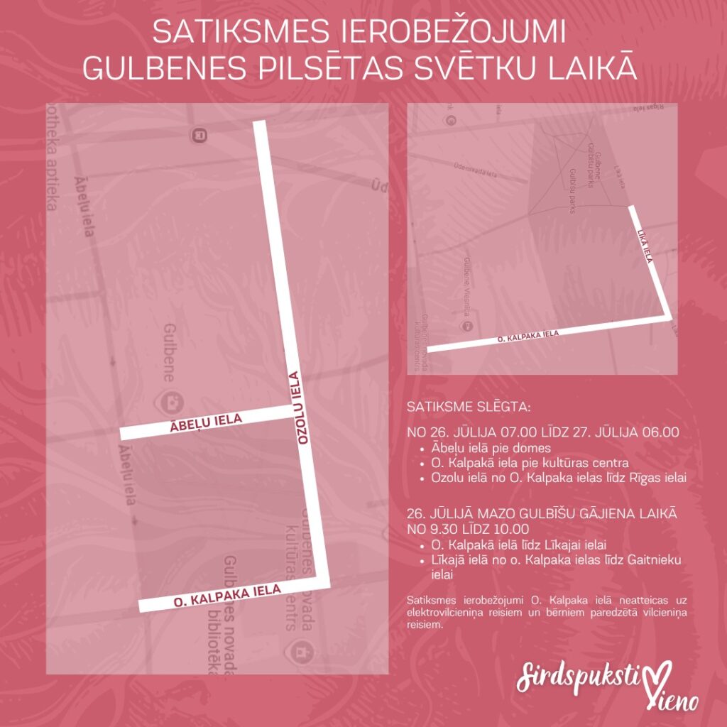 Satiksme Gulbenē no sestdienas, 26. jūlija, pulksten 7.00 līdz svētdienas, 27. jūlija, pulksten 6.00 satiksme tiks slēgta šādās vietās: Ābeļu ielā 2 pie Gulbenes novada pašvaldības ēkas, O.Kalpaka ielā pie Gulbenes novada kultūras centra, Ozolu ielā no O.Kalpaka ielas līdz Rīgas ielai.