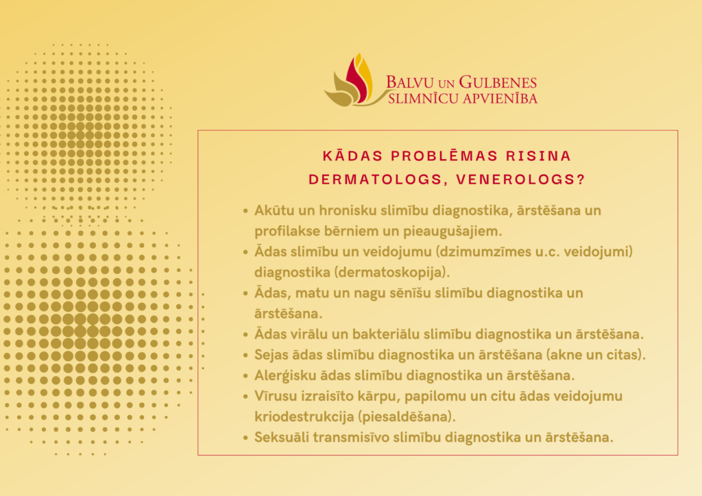 Sākot ar februāri ir izmaiņas SIA “Balvu un Gulbenes slimnīcu apvienība” dermatologa, venerologa ambulatorajām pieņemšanām. Par to informē SIA “Balvu un Gulbenes slimnīcu apvienība” sabiedrisko attiecību speciāliste Lana Upīte.