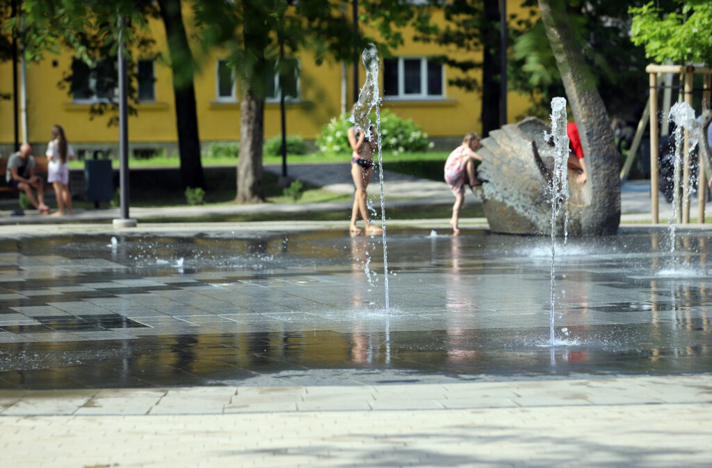 KARSTĀ LAIKĀ bērni labprāt dzīvojas pa Gulbīšu parka strūklaku, un to arī drīkst darīt, tikai nedrīkst ar kājām spiest strūklakas izejas ūdeni. FOTO: GATIS BOGDANOVS