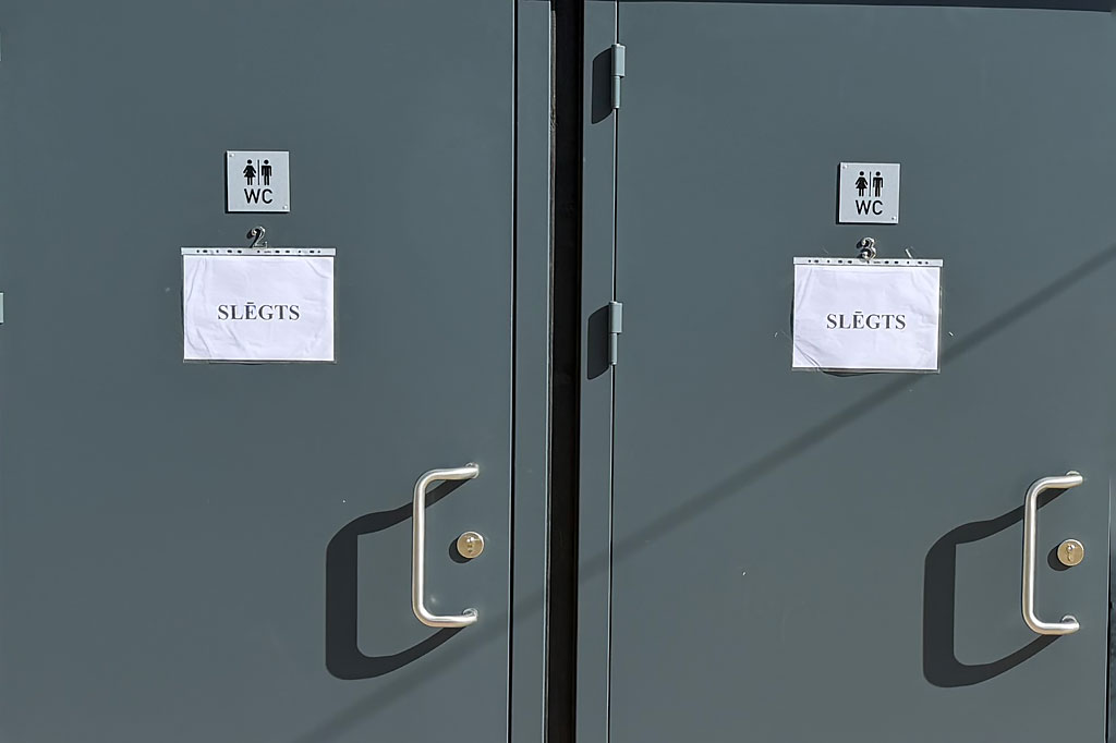 “Slēgts” – šāds uzraksts otrdien, 14. aprīlī, pēcpusdienā bija redzams uz visām publiskās tualetes durvīm. Foto: Diāna Odumiņa