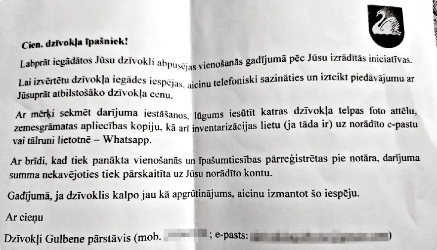 Renovētās daudzdzīvokļu mājas Gulbenē, Skolas ielā 1, iedzīvotāji savās pastkastītēs saņēmuši aicinājumu, kur zvanīt vai rakstīt, ja kāds no viņiem vēlas pārdot savu privāto dzīvokli.