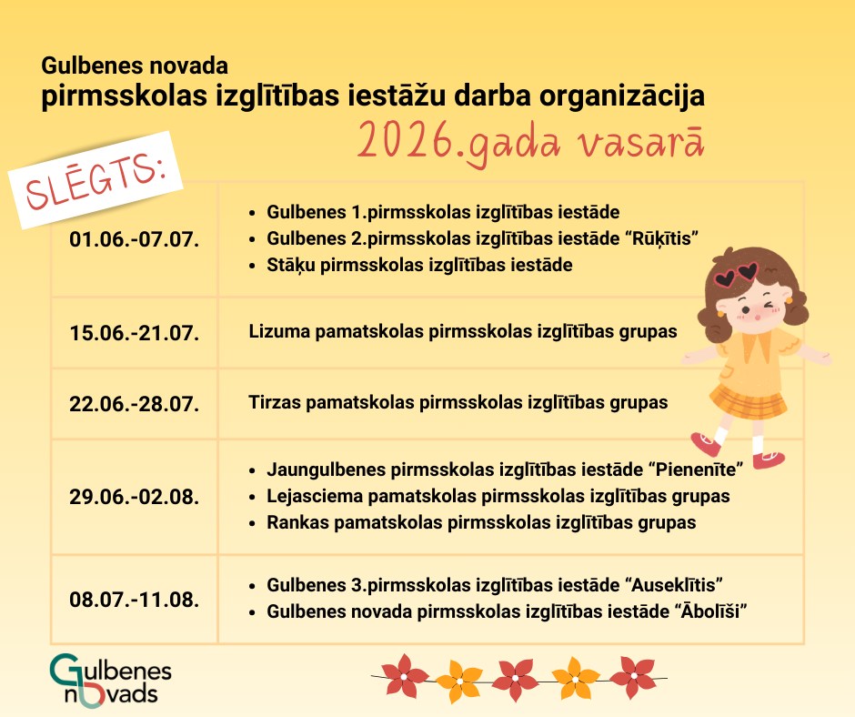 Gulbenes novada pasvaldība aicina vecākus iepazīties ar Gulbenes novada pirmsskolas izglītības iestāžu darbu vasarā.