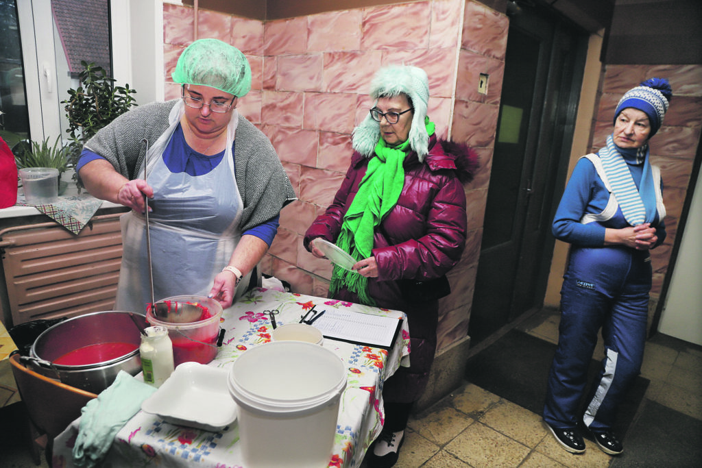Zupu Jeļena Jermacāne izdala aptuveni 15 minūtēs. Viņa jau ievērojusi cilvēkus, kas nāk pēc zupas. “Ir, kuri “pazūd” pensijas dienās. Tad zupu nevajag. Ir, kuri ļoti regulāri nāk. Reizēm parādās arī jaunas sejas. Ir arī gadījumi, kad slidenā laikā ziemā cilvēki piezvana un pabrīdina, ka neatnāks,” stāsta J.Jermacāne. Savukārt Ausma (vidū), kura atnākusi pēc zupas, “Dzirkstelei” uzsver: “Zupas virtuve ir ļoti nepieciešama. Es pati nāku visu laiku.” Foto: Gatis Bogdanovs.