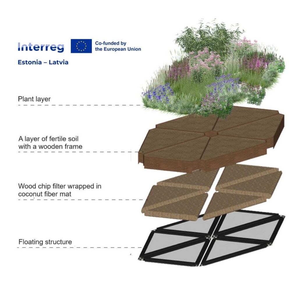 “Sala tiek veidota no vairākiem atsevišķiem moduļiem un ir nostiprināta ar enkuriem. Tās maksimālais izmērs var būt 94,5 kvadrātmetri, un bojājumu gadījumā moduļi tiks mainīti. Tiem apkārt būs estētisks koka rāmis, kokšķiedras paklājs un augsne ar izvēlētiem augiem,” skaidroja M.Augškāpa.