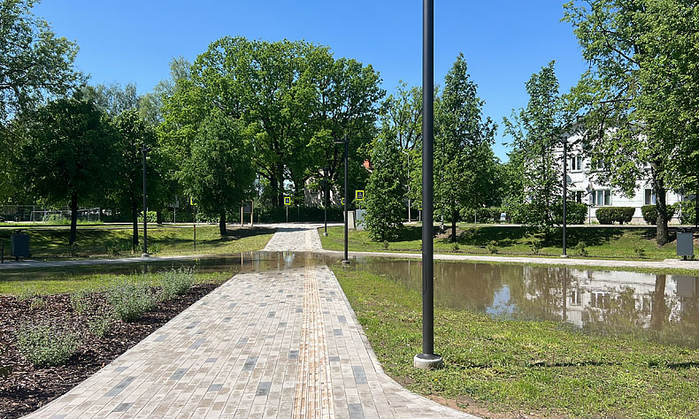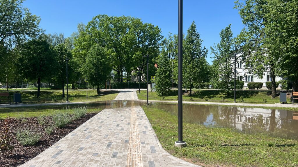“Dzirkstele” sazinājās ar Gulbenes pilsētas pārvaldes vadītāju Gintu Āboliņu, kurš skaidro, ka projekta autora lietus ūdens risinājums ar drenējošu nosegtu šķembu/oļu lietus kanalizācijas tīklojumu nedarbojas, vai pareizāk sakot, darbojas ļoti, ļoti lēnu. “Būvuzraudzība pie objekta nodošanas teica, ka vajag izaugt zālītei. Zeme sāks “elpot”, un ūdens iesūksies ātrāk. Tam īsti neticu, tāpēc foto, video ar pārplūdušo parku esmu nosūtījis visiem – autoram, būvniekam, būvuzraugam, lai piedāvā risinājumu, jo tas nav pareizi, ka visur ir peļķes. Būvnieks, saņemot video, uzreiz man atzvanīja. Viņi ir gatavi braukt un darīt. Īsti ko darīt, lai pasakot projektētājs,” skaidro G.Āboliņš un piebilst, ka gribētos, lai šajā situācija nevis meklējam grēkāžus, bet gan ātru un pareizu risinājumu, lai situāciju labotu.