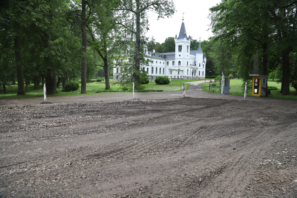 SĀKUŠIES BŪVDARBI autostāvvietas laukumā pie Stāmerienas pils. Tas nozīmē – kādu laiku tūristi savas automašīnas tur novietot nevarēs. Tās būs jāatstāj pie tautas nama vai stāvvietā pie parka un jāiet uz pili kājām. FOTO: GATIS BOGDANOVS