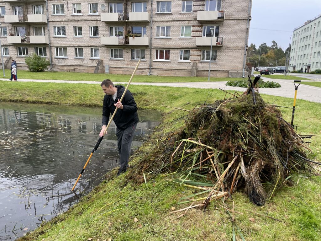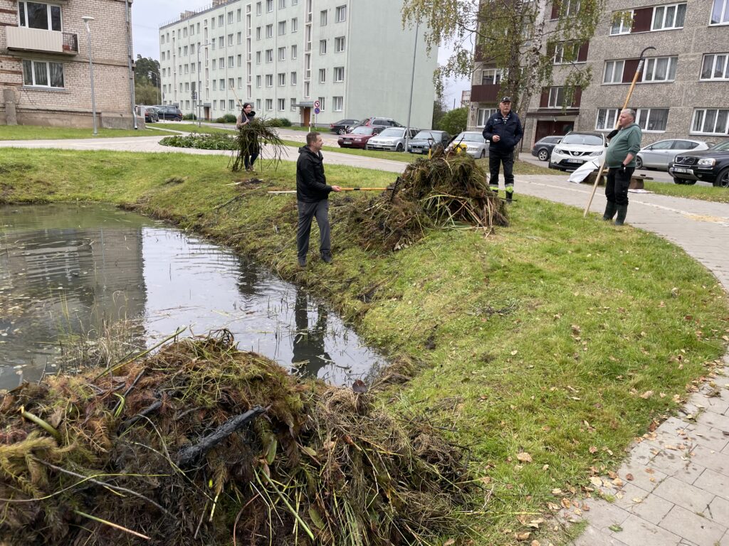 No ūdenszālēm, koku zaru atlūzām un dīķī nonākušiem atkritumiem ūdenstilpe tika tīrīta, izmantojot grābekļus garos kātos. Iedzīvotāji šādi strādāja vairākas stundas. Starp viņiem bija divi deputāti – Jānis Barinskis un Guntis Princovs, kuri arī dzīvo Skolas ielas kvartālā.