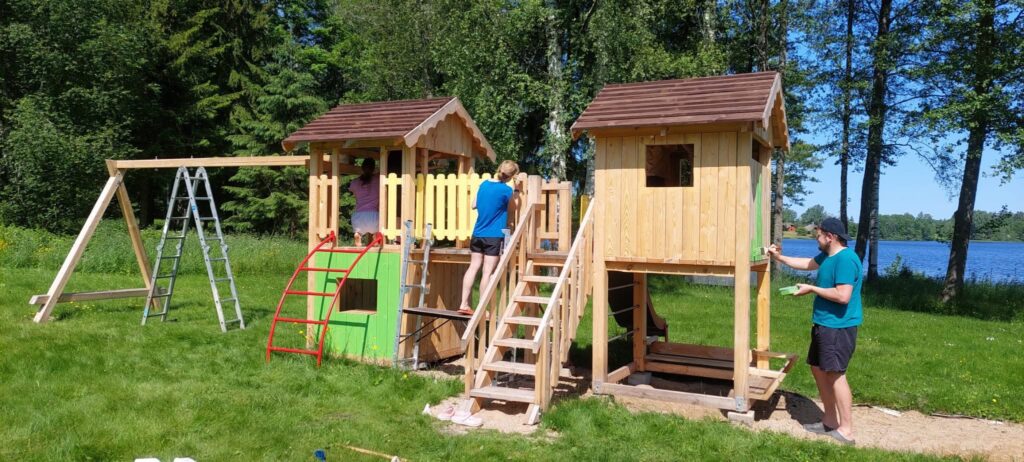 STĀMERIENAS IEDZĪVOTĀJI kopīgiem spēkiem atjauno divus bērnu spēļu laukumus pie Stāmerienas ezera. Jaunā krāsojumā ietērpts arī spēļu laukuma namiņš pie kuģīša piestātnes. FOTO: “FACEBOOK.COM”/STĀMERIENAS PAGASTS