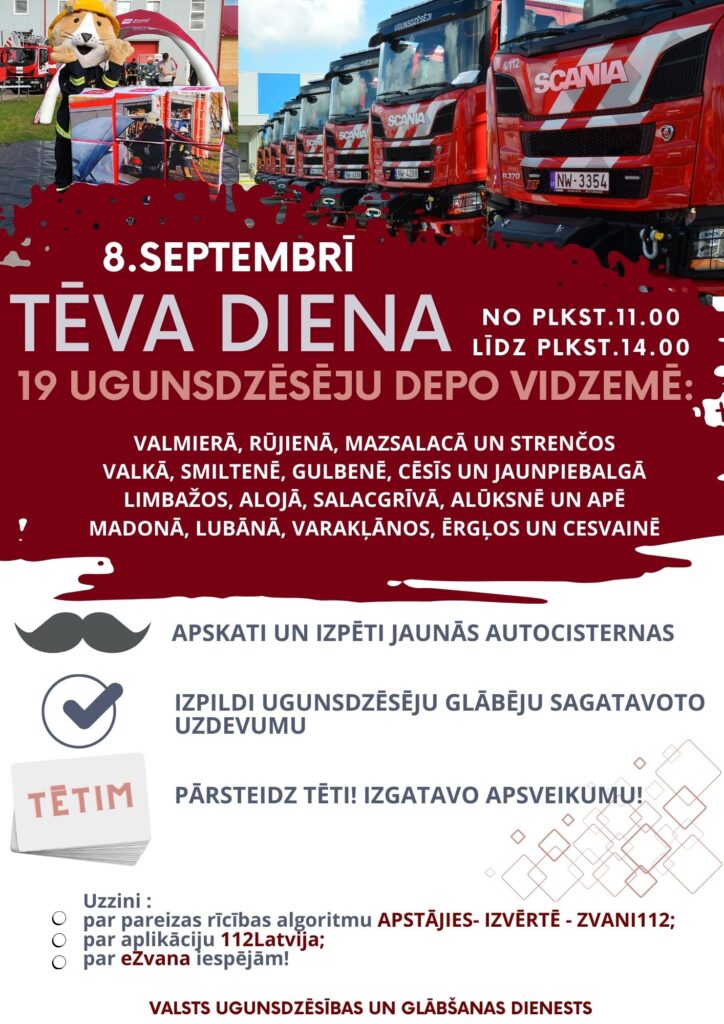 Valsts ugunsdzēsības un glābšanas dienesta Vidzemes reģiona pārvalde aicina ikvienu Tēva dienā, 8.septembrī, no plkst. 11.00 līdz 14.00 apciemot ugunsdzēsības depo Gulbenē, lai aplūkotu un iepazītu šogad iegādāto specializēto transportu, noskaidrotu neskaidro par ugunsdrošību mājā, ceļā vai skolā, kā arī izpildītu ugunsdzēsēju glābēju sagatavoto uzdevumu.