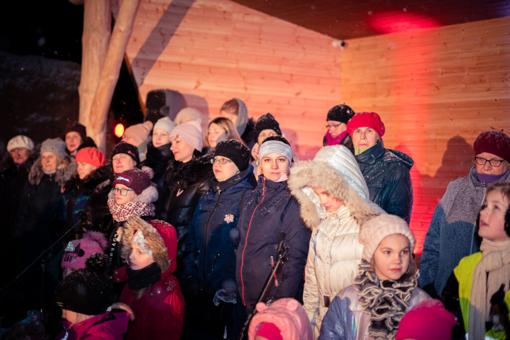 “Plašākus koncertus noteikti jaunatklātā estrāde piedzīvos vasarā, tomēr pirmās dziesmas šeit izskanēja, stāvot apsnigušajā Rijas kalnā, kur kupls vietējo iedzīvotāju pulks bija sanācis svinēt gan 18.novembra svētkus, gan estrādes atklāšanu. Svētku sajūtu ikvienam radīja Jaungulbenes amatiermākslas kolektīvi – bērnu popgrupas “Dzērvenes” un “Dzērvenītes”, senioru ansamblis “Kamenes”, sieviešu koris “Liede” un postfolkloras grupa “Dadzes”. Foto: Aleksandrs Lustiks.