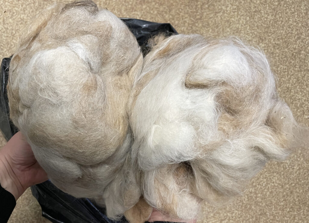 A.Riekstiņas dāvinātā suņu vilna ir krāta gadus desmit vismaz un ir tikai un vienīgi šķirnes suņu vilna. Agras sirdslieta ir kinoloģija, viņa mācījusi paklausību ne tikai citu saimnieku suņiem, bet pati gadu gaitā bijusi vairāku suņu īpašniece. Ja šādam ķepainim ir ar pavilnu bagāts kažoks, to obligāti vajag ķemmēt. Un tā Agra ir sakrājusi vilnu no diviem īru seteriem – Klēras un Greisas, četriem vēja suņiem – Brustera, Sniedziņa, Ances un Nensijas un beļģu aitu suņa Rosa. Kopā ir sanācis prāvs maiss, kas sver aptuveni trīs kilogramus. Agras vēlējums adītājai Ausmai: “Turpiniet adīt, radot prieku sev un apkārtējiem!”