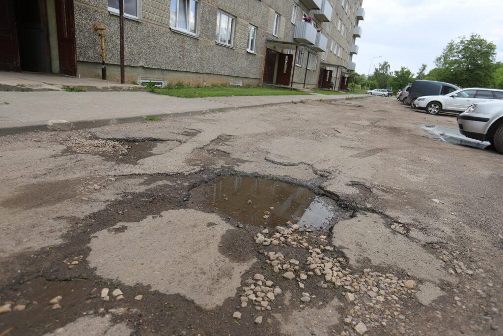 Daudzdzīvokļu mājas Nākotnes ielas 2/1 Gulbenē priekšas ceļa segums ir sliktā stāvoklī – dziļas, lielas bedres. Var saprast gan autovadītāju, gan arī pašu iedzīvotāju neapmierinātību. Foto: Gatis Bogdanovs.