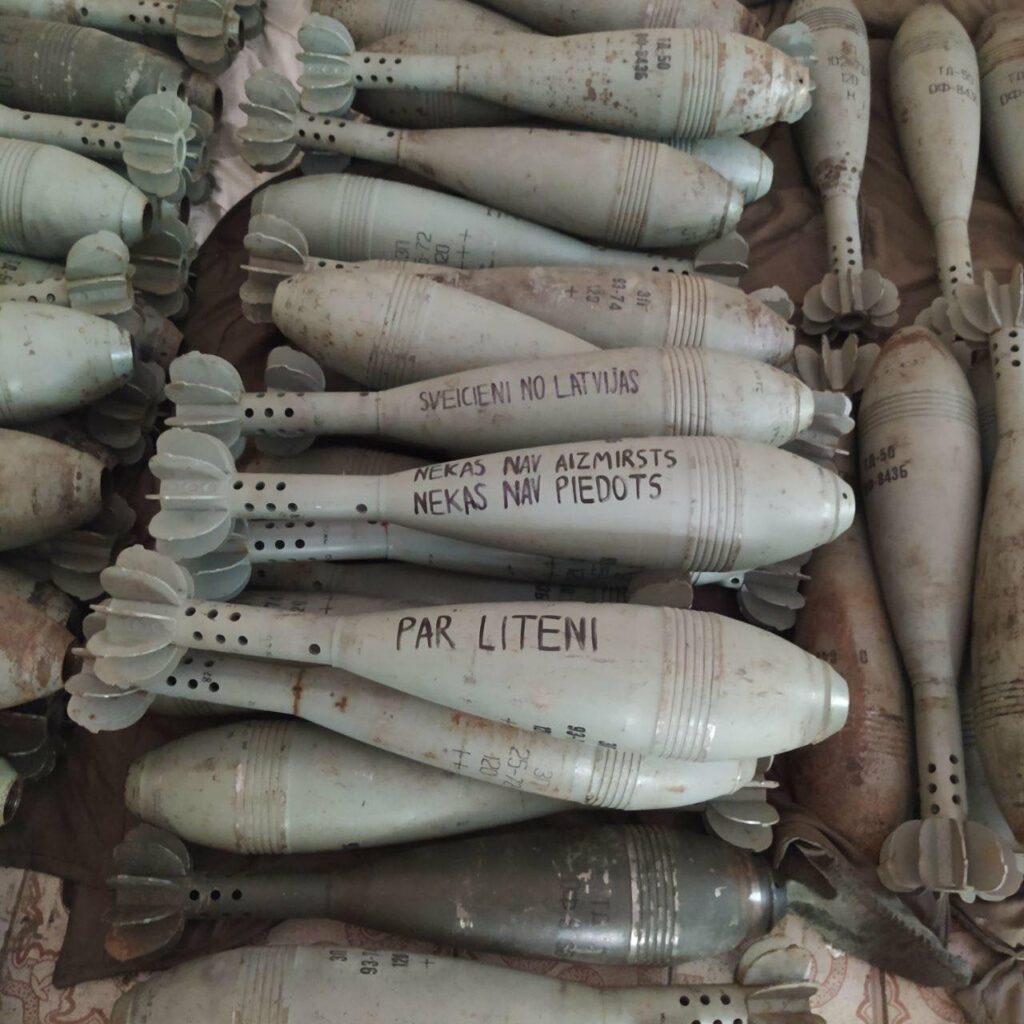 “Dzirkstele” sazinājās ar biedrību “SOS palīdzība Ukrainas armijai” un noskaidroja, ka šie lādiņi ir īsti un ir Ukrainā. Latviešu brīvprātīgie, kas tur atrodas, ir uzrakstījuši šādus uzrakstus uz tiem. “Tas ir par mūsu latviešu nogalinātajiem virsniekiem Litenē, kuri tur gāja bojā. Tie ir 120 mm mīnmetēja lādiņi. Ar tiem šauj uz okupantu armijas pusi, un tā ir dzīvā realitāte,” laikrakstam paskaidroja biedrības pārstāvji.