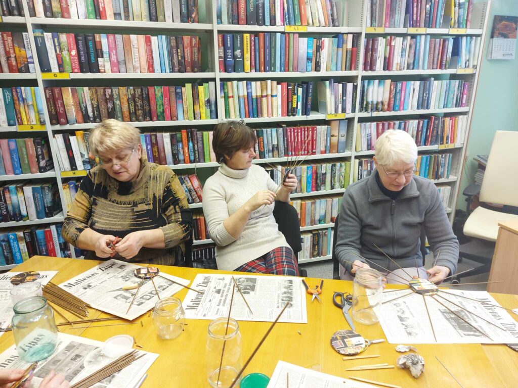Zeltiņos biedrības aktīvisti parūpējās par radošu darbnīcu pagasta senioriem. Zeltinietes Aijas Prancānes vadībā no pareizos leņķos sagrieztām “Malienas Ziņām” uz “bēdīgo” lietussargu adatām divu dienu darbnīcās sapina grozus. Ne viss padevās tik viegli, un daudz darba tika ieguldīts arī starp tikšanās reizēm, darbojoties mājās, lai būtu pietiekami materiāla groza izveidei. Aija arī parādīja citus savus radošos meistarstiķus, un darbnīca turpinās savu darbību arī vēl janvārī. Un, ja nu kāds vēl ir ieinteresēts darboties, tad bibliotēkā var pieteikties uz ievadnodarbību, lai janvārī būtu iespējams pilnvērtīgi darboties. Patiess prieks par Aijas drosmi uzņemties vadību un nodot savas prasmes apkārtējiem.